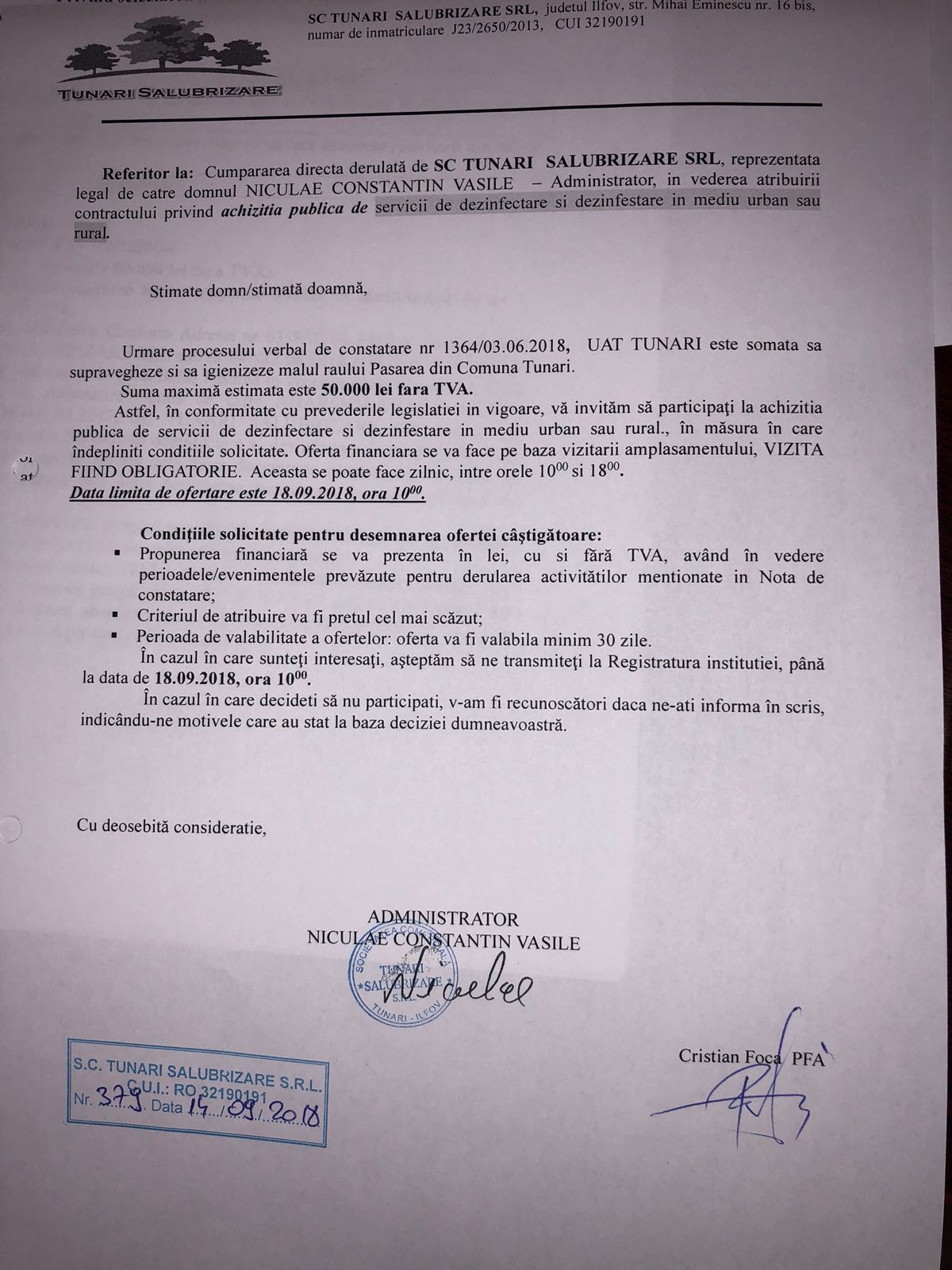 Invitatie nr. 375/14.09.2018 la atribuirea contractului privind achizitia publica de servicii de dezinfectare si dezinfestare in mediul urban sau rural.